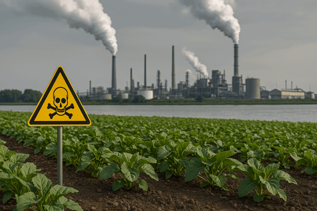 Farmland positioned beside industrial pollution showing how environmental chemicals enter food systems